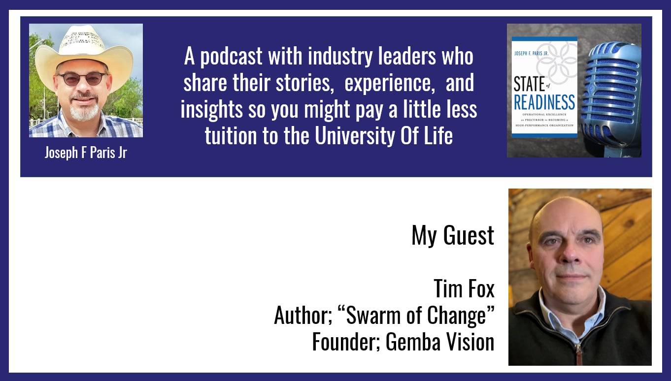 Listen to the full conversation with Tim Fox on the State of Readiness podcast. You can learn more about Tim’s work and pick up a copy of Swarm of Change at swarmofchange.com, and explore GEMBA Vision at gembavision.com.